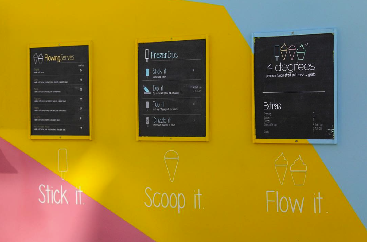 They also serve four different concepts of ice cream: softserve, ice cream on sticks, gelato scoops with a twist, and the fourth concept is a surprise.