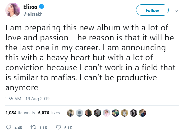 Lebanese superstar, Elissa just dropped a major bomb on the entire music industry and the millions of her fans with an unfortunate announcement. The icon tweeted that her next album will be her last in her career. She then elaborated that the reason behind her quitting after the next album is because the industry feels like a mafia and that she can’t be productive anymore in such an environment.