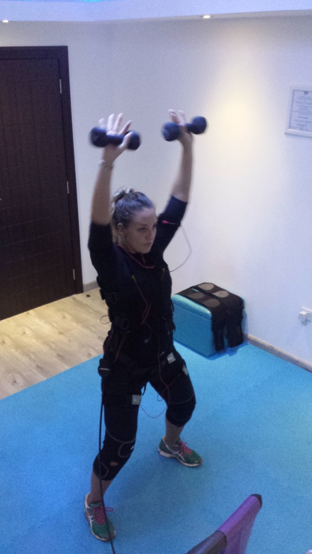 I had signed up for an EMS session. EMS stands for Electro- Muscle Stimulation in which a device is hooked up to a jacket and Velcro straps through which electricity is distributed.