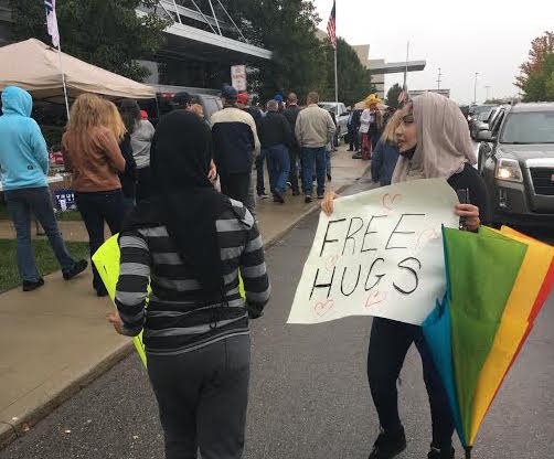 Hajer Sbehawi, 25, and her 12-year-old sister offered free hugs to Donald Trump supporters waiting to get into his rally in Novi, Michigan, on Friday. The older sister told BuzzFeed that in about 15 minutes she got five hugs only, which made her sad. Their goal was to at least give out 1000 hugs.
