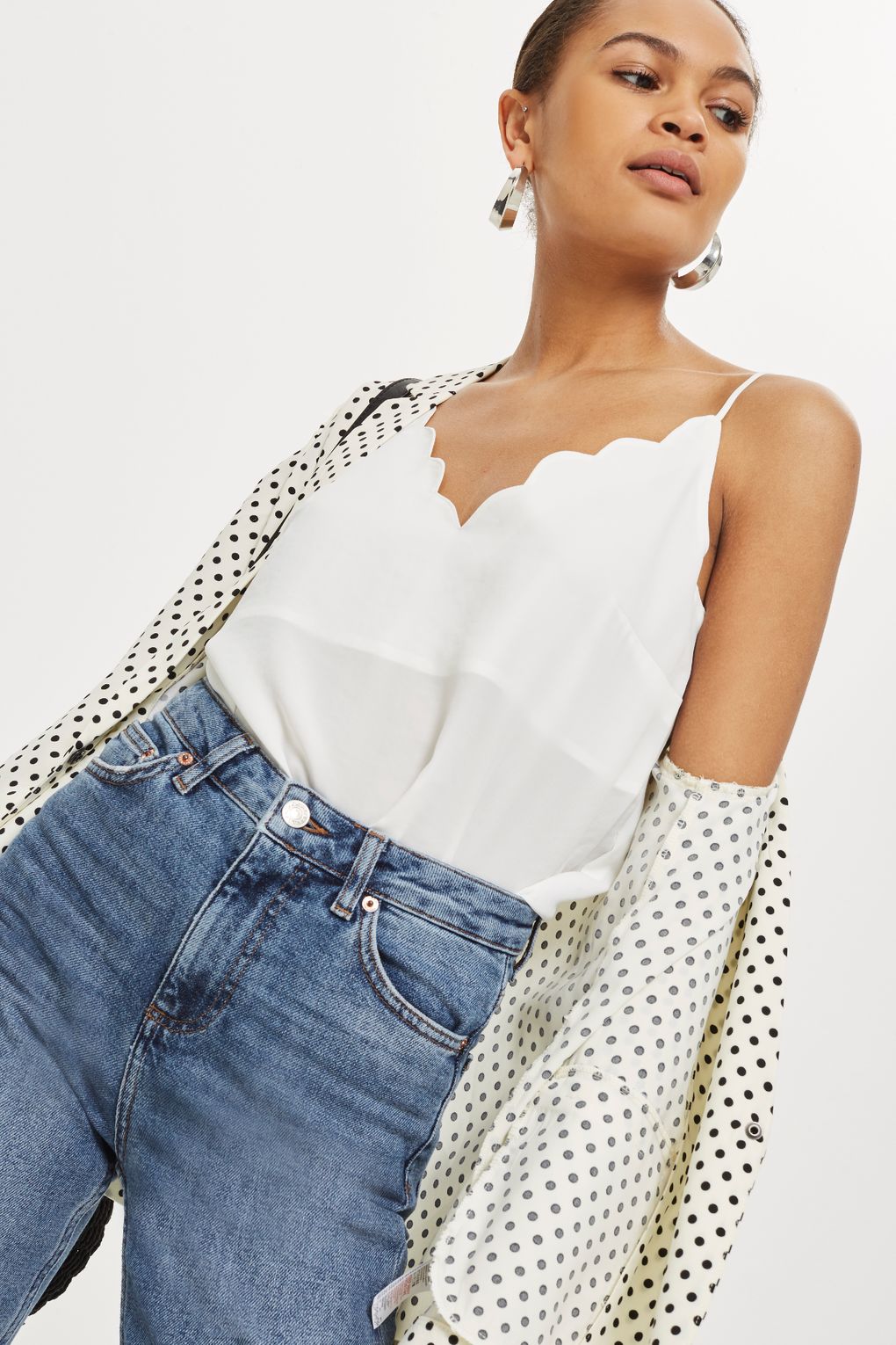 Tuck in your white cami top in a pair of mom-fit jeans and add a silk shirt or cardigan with one shoulder down. Complete this hot outfit by tying your hair back and wearing a pair of hoop earrings. Congrats, you now look latina-hot!