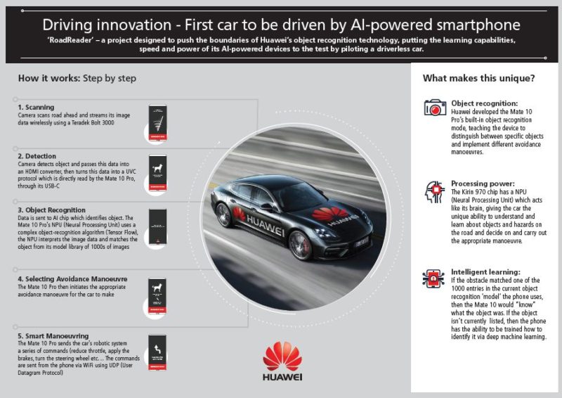 “Our smartphone is already outstanding at object recognition. We wanted to see if, in a short space of time, we could teach it to not only drive a car, but to use its AI capabilities to see certain objects, and be taught to avoid them” said Andrew Garrihy, Chief Marketing Officer, Huawei Western Europe. “If our technology is intelligent enough to achieve this in just 5 weeks – what else can it make possible?”