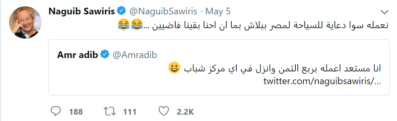 مشاهده ممتعه🙄👆🏻…. كان قاللى كنت عملته بنص الثمن و جيت على حسابى و قعدت عند اصحابى 😂— Naguib Sawiris (@NaguibSawiris) May 4, 2018
