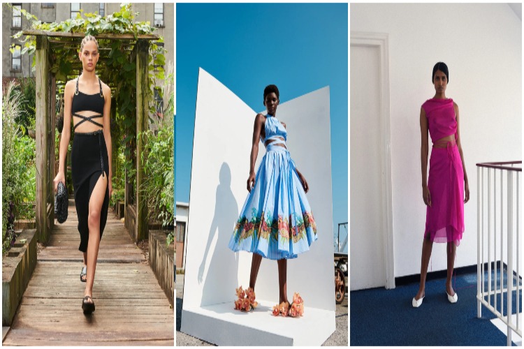 A series of crisscrossing and wraparound details emerging so much structure in futuristic and minimal designs. It can emerge from a skirt, or from the aforementioned bralette.