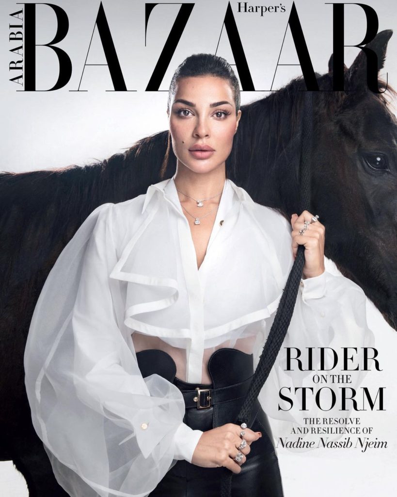 We saw Nadine Nassib Nijem on the cover of Harper Bazaar Arabia with a high fashion top of sheer fabric, and she looked stunning.