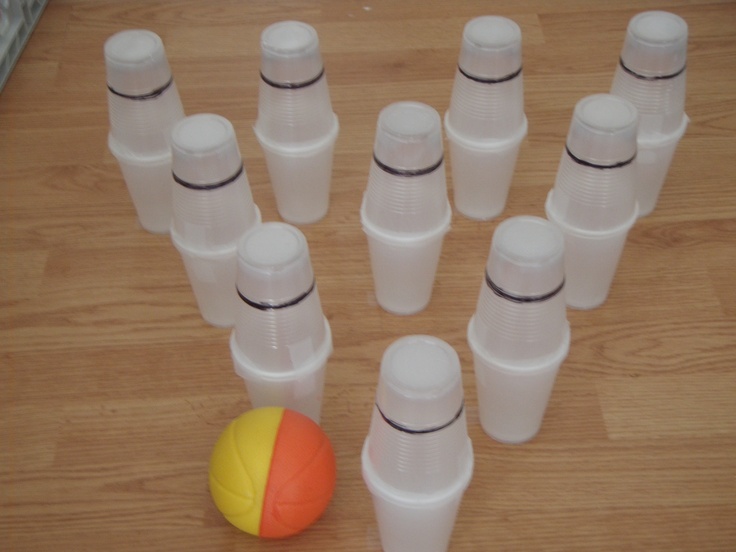 Ask your children to collect all empty bottles or plastic cups around the house and get a rubber ball. Find a spot where nothing can be broken and make up your own bawling hall with a shoes wrack and maybe popcorn.