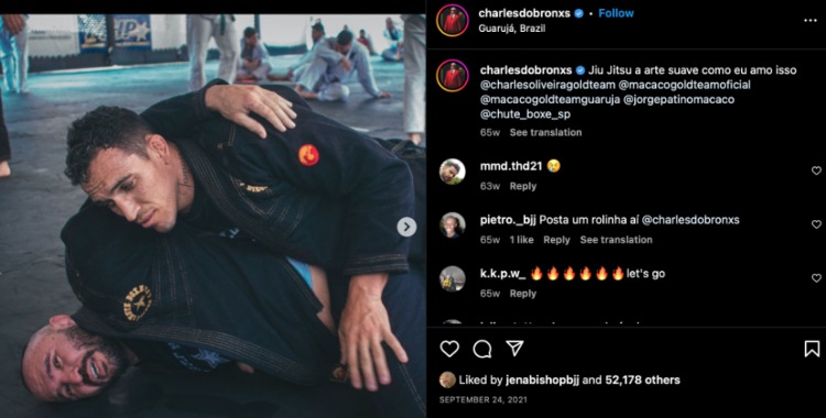 Charles Oliveira is a third-degree Black belt in Brazilian Jiu-jitsu. He started training at the age of 12 under Roger Coelho. He won his first major jiu-jitsu competition in 2003 at the Sāo Paulo State Championship. He currently competes in the lightweight division of UFC where he is a former lightweight Champion.