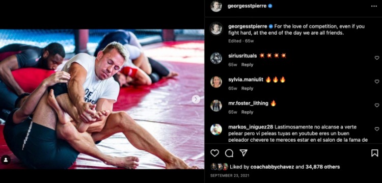 George St. Pierre trained BJJ at Renzo Gracie’s gym in New York to polish his grappling technique against BJ Penn for their bout at UFC 58. Renzo Gracie awarded St. Pierre with his brown belt in 2006 and in 2008 St. Pierre earned his black belt under Bruno Fernandes.