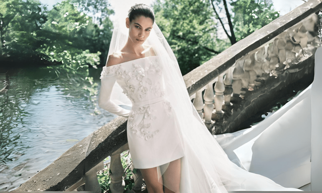 To experience her artistry during your wedding, we recommend going for her Les Valenciennes collection, inspired by Valencia’s exquisite architecture. Our pick from the collection is Gardenia, the high and low gown with cordonnée Lace with a back cascade of Gaza and silk Organza flowers.