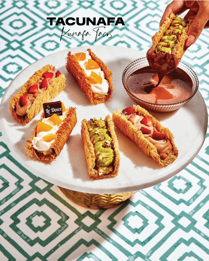 If you want something light but still packed with flavor, Tacunafa is the right Ramadan dessert for you. Imagine crispy kunafa shaped like a taco, stuffed with creamy goodness and fresh fruits. And the best part? It comes with a dip. Sweet, crunchy, and totally Insta-worthy.