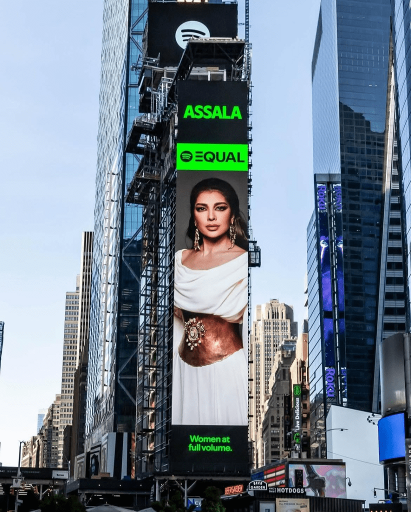 Assala’s face hit Times Square in 2024, marking her album Thumma Ana and her status as a powerhouse of pan-Arab vocals.