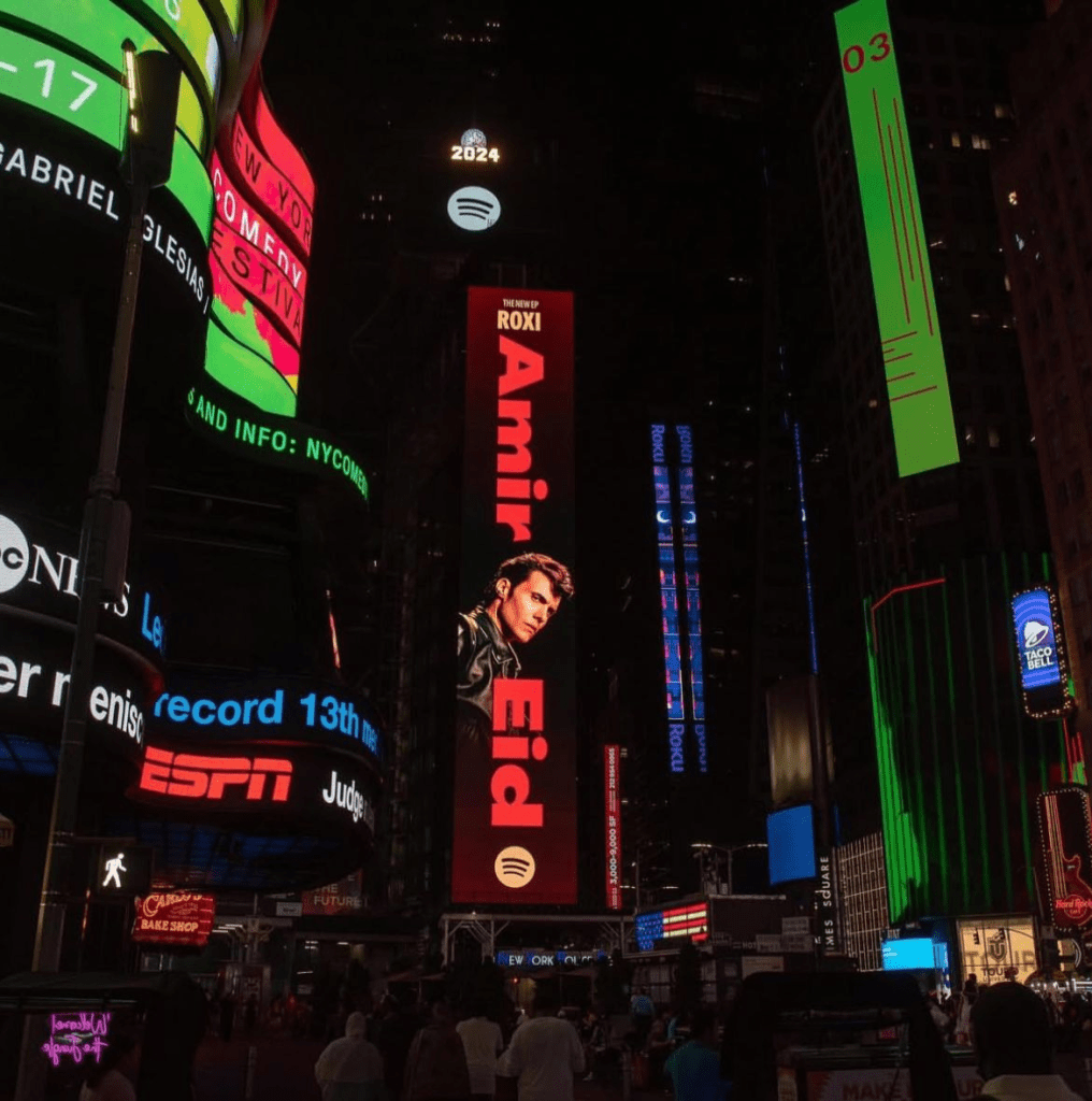 In 2024, Amir Eid — the frontman of Egyptian rock band Cairokee — made his solo Times Square debut with Roxi, his first EP. The five-track project (including Hagat Gowaya, Esmek Eah, and El Donia Hoss) unfolded across three cinematic chapters, blending music and visuals into an emotional love story.