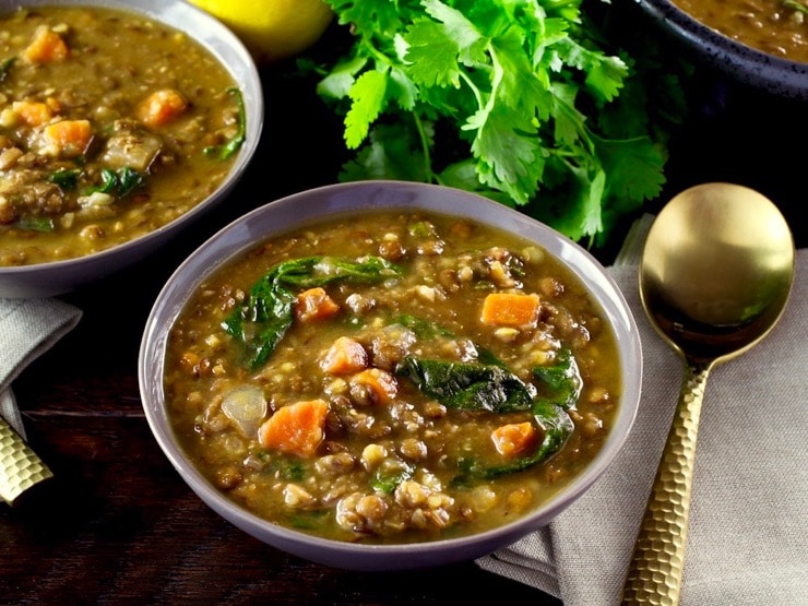 3) Add the cumin and coriander and sauté an additional 30 seconds then add the vegetable stock and lentils and bring to a simmer.