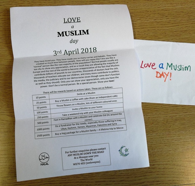 In response to the previous hate-mail, a replica of the abusive letter was issued but, this time, promoting love and acceptance of Muslims. Titled “Love A Muslim Day,” instead of awarding points for violence, it’s awarded points for acts of kindness.