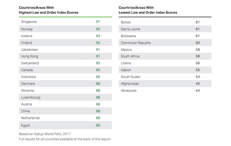Around 148,000 adults were interviewed in 142 countries and areas. The survey involved questions about whether interviewees felt safe at night, whether they have previously experienced cases of theft or assault, and their overall confidence in their local police.