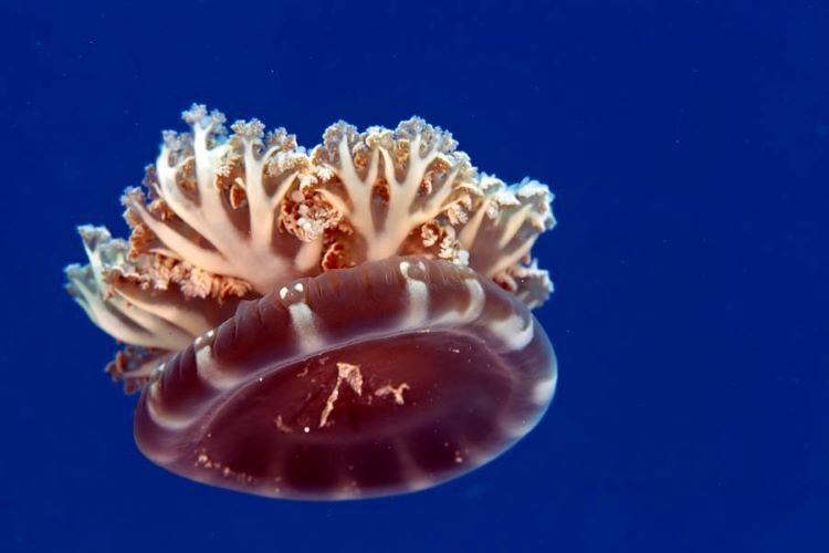 The upside-down jellyfish; it usually lives in the intertidal sands and shallow lagoons and has its mouth facing upward, which is where it gets its name from. Its sting can cause mild pain, swelling and rash.