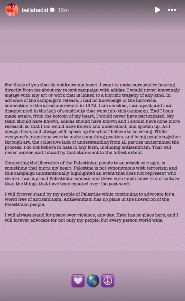 Hadid expressed her shock and disappointment, noting, “My team should have known, Adidas should have known, and I should have done more research so that I, too, would have known, understood, and spoken up.”