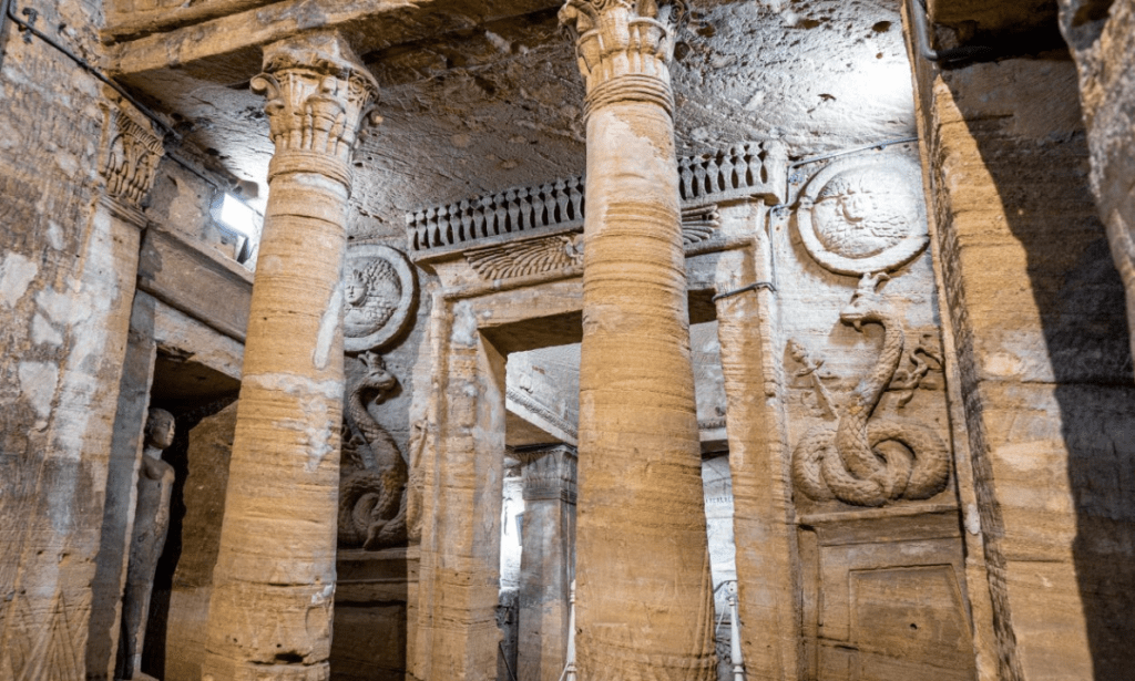 Discovered by accident in 1900 when a donkey fell into a 30-meter hole, the Kom El Shoqafa Catacombs combine the three top ancient civilizations: Greece, Rome, and Egypt.