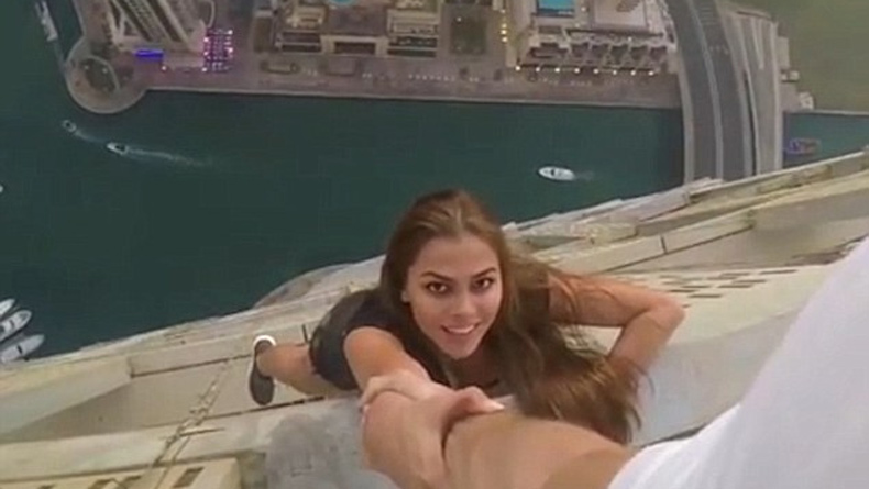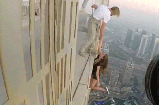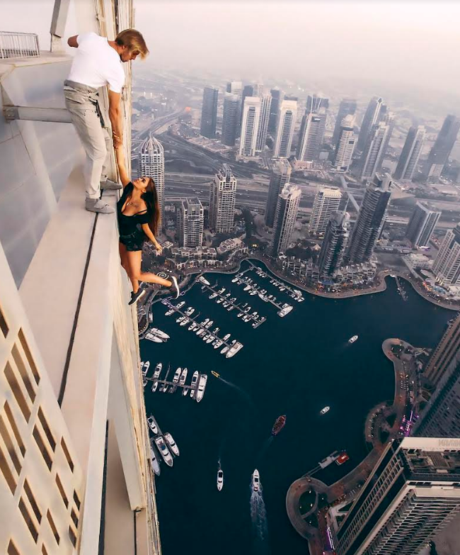Viktoria Odintsova, 23, clamboured onto a narrow ledge with no safety equipment whatsoever on the Cayan Tower in Dubai. Yup, she was held only by the hand of a male assistant as she dangled from the 1,004-foot tall skyscraper.