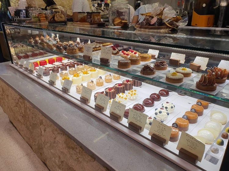 Generally, their actual display cases, which take up 70% of the room, are exquisite. Lined with rows of gem-like lustrous pastries with equally luxurious names emblazoned on neatly stacked thick label cards that would read out “Framboise” or “Exotic Fruit Pavlova.” As you walk toward their handmade chocolate display, you’ll even notice three large poster-like screens surrounded by thick black borders that display videos of what occurs behind the scenes in their kitchen.