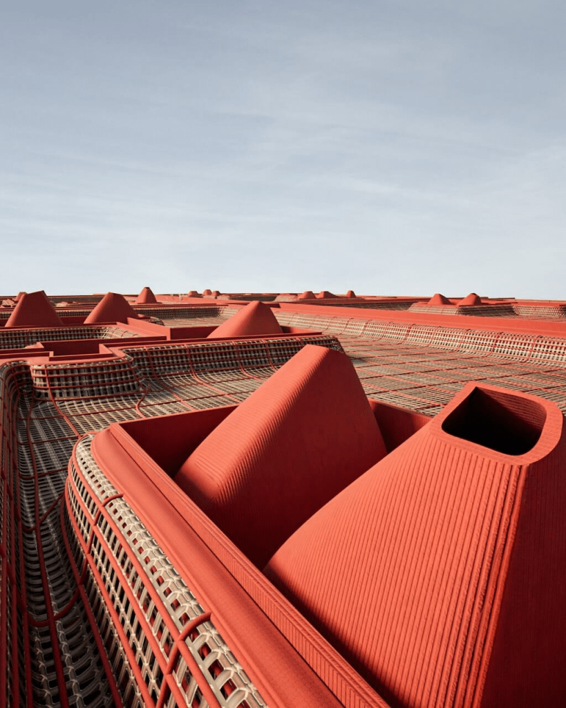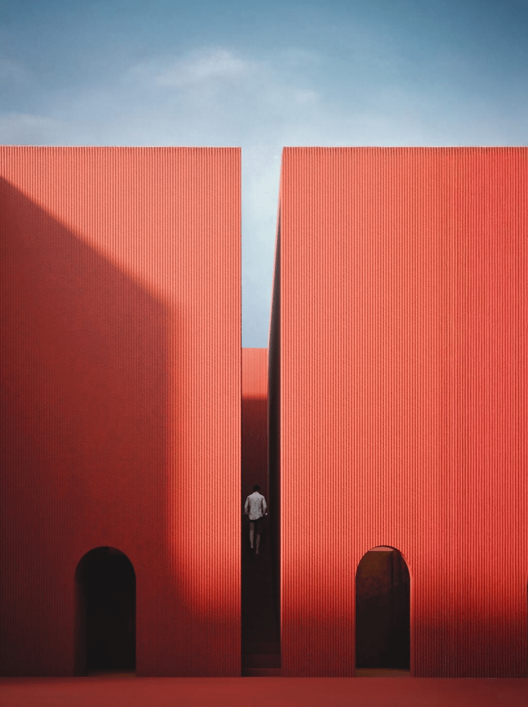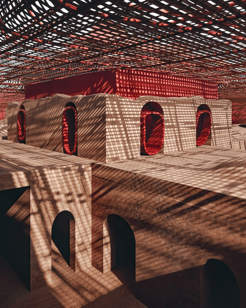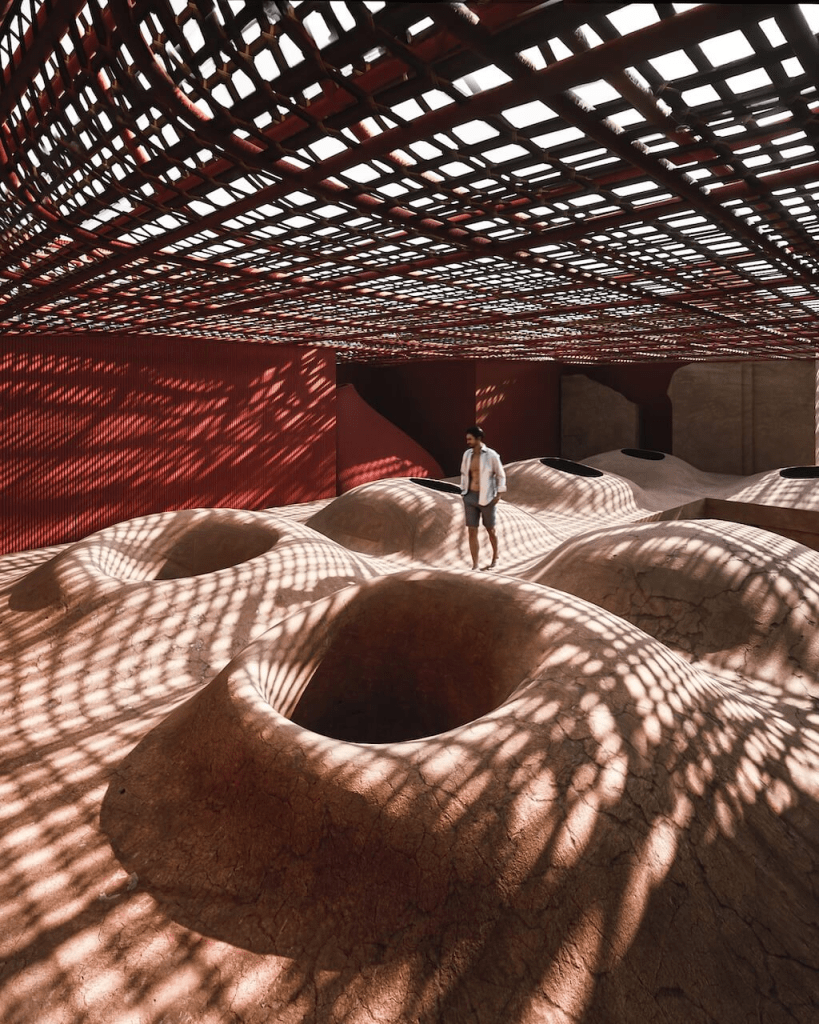 The designers made the entire hotel a sensory playground, encouraging guests to touch the textured mud-brick walls, watch sunlight filter through the perforated red lattice above, wander up and down stepped levels, and feel the atmosphere shift as the architecture changes. The whole experience ends with a panoramic view of the epic mountainscape, tying the human-made to the majestic natural world.