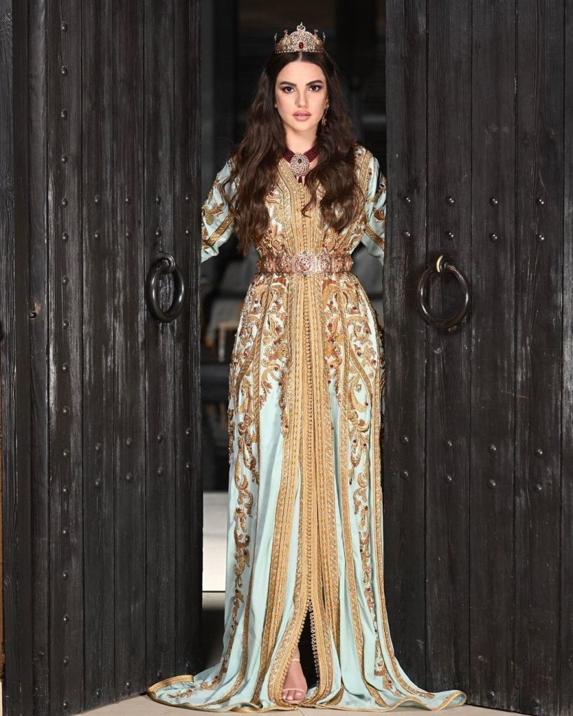 Wrapped in a soft mint takchita for a magazine photoshoot, heavy on gold embroidery and finished with a statement belt and crown, Dorra leans fully into Moroccan royalty but keeps it modern. The look is dramatic without trying too hard, editorial but still grounded.