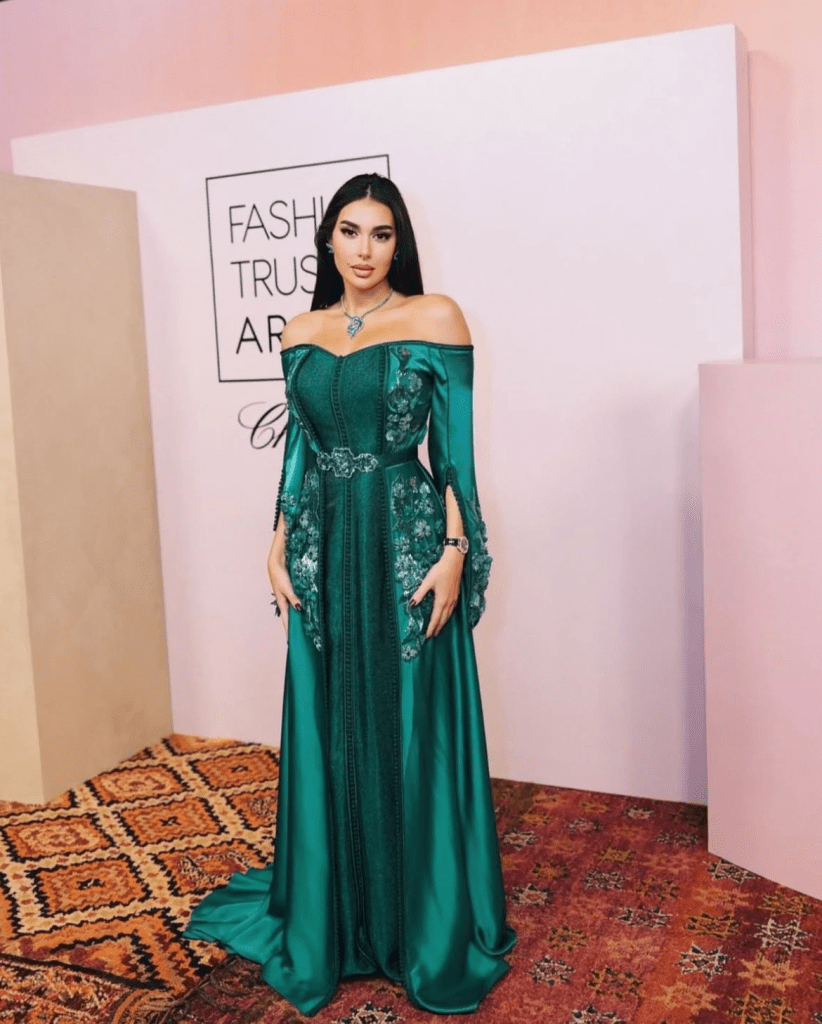 At Fashion Trust Arabia in Marrakech, Yasmine Sabry stepped out in a deep emerald custom made caftan by Selma Benomar. The off-shoulder cut adds a contemporary edge, while the floral embellishments and structured bodice stay true to traditional Moroccan techniques. It’s dramatic, polished, and unmistakably rooted in place.
