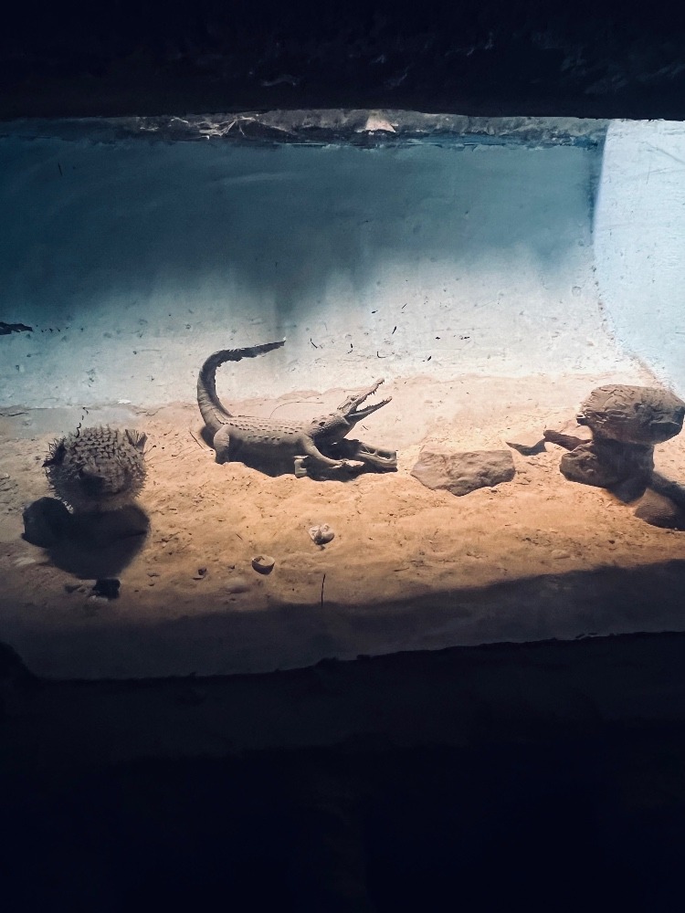 After climbing to the top, I descended into the caves in search of fish, but there was a twist in store. The tanks were empty and had no fish in them. Instead, I found several amphibians and reptiles that were mummified naturally and had been preserved for display. Many different fish species can also be found in the same environment as those seen below, from crocodiles to puffer fish.