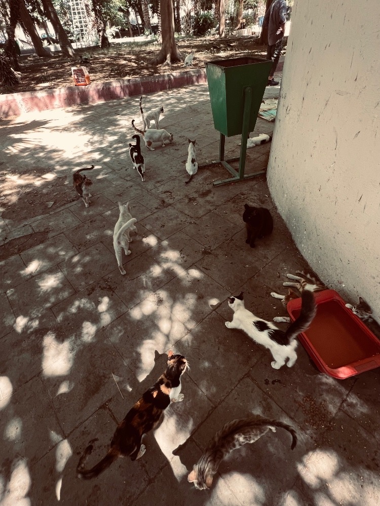 Finally, on my way out of the garden, I found this place in the corner behind the cafeteria that was flooded with cats. There was a man who was feeding them and even got them chicken wings for lunch. As I approached this man, he turned out to be called “Rob” and has been living in Egypt for almost 27 years. He is originally from the United States and came to Egypt to visit, but then fell in love with the country and decided to move and live here for the rest of his life. He explained that he comes every morning to feed those cats, relax a bit in the garden, then take few of them to the vet so they can get the necessary shots and then returns them back to the garden. He even told me that he named a few of them and his favourite one was called “Shawkia.”