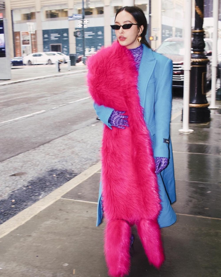 You can see that influence in Faouzia’s clothing with the angular shapes and pops of color in some elements of her clothing whether she’s taking a casual stroll through the city or performing in one of her music videos.