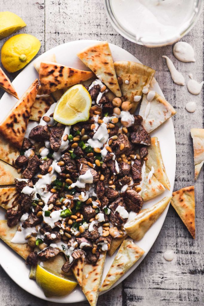 Roasted pine nuts, beef, and generously tahini drizzled nachos is a fatteh-nacho love affair. Dress up with chickpeas and spiced beef, then squeeze some lemon. Although fatteh is a staple in most Arab countries, this is a more impressive presentation.