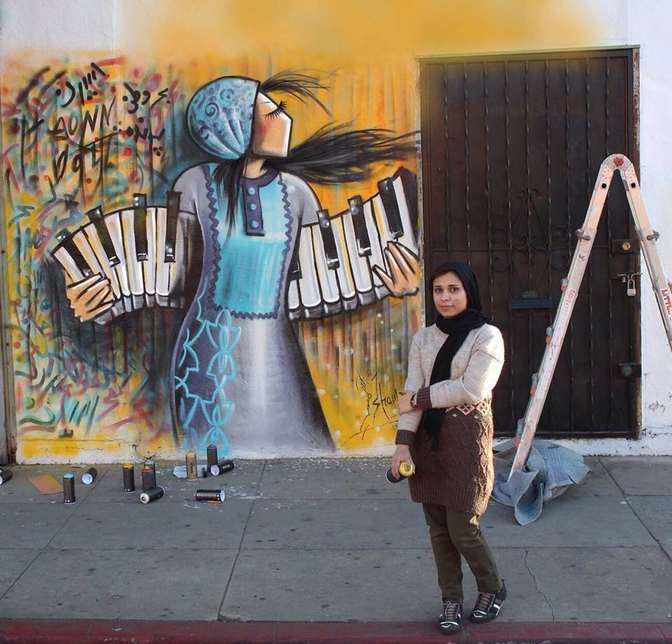 In an interview with the LA times, she said that it’s not very often that she goes out to paint on public walls. “I have a small studio. It’s a balcony off my living room. I paint canvases and paper there. When I find everything OK, I will go outside and paint. Mostly not very public spaces, like small roads or the roads of the university — some place I feel is more safe. The university will sometimes give me permission and support me.”