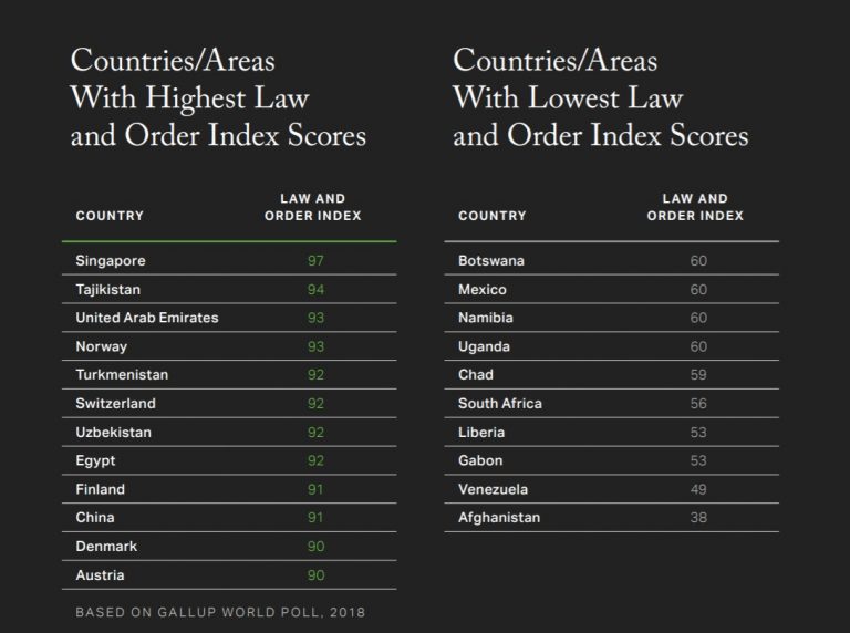 The Gallup Law and Order Index is a yearly survey that assesses citizens’ sense of personal safety and their faith in law enforcement.