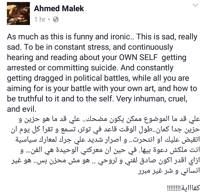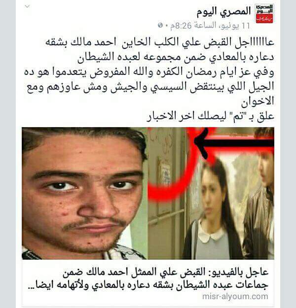 Ahmed Malek honestly has had enough. His latest post on Facebook sees him sharing one of the most horrendous rumors circulating about him, asking everyone to simply concentrate on his art. A fake Al Masry Al Youm page shared a post claiming that Malek was arrested, among other devil worshipers, during a prostitution raid.