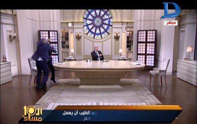 El Tayeb accused Shobeir of lying, implying that he has ties to Qatar, and then said something about Shobeir’s wife and kids. That’s when sh*t hit the fan. Shobeir started screaming and threw water at El Tayeb from across the table before crossing the stage and getting physical. The show quickly cut to commercial.