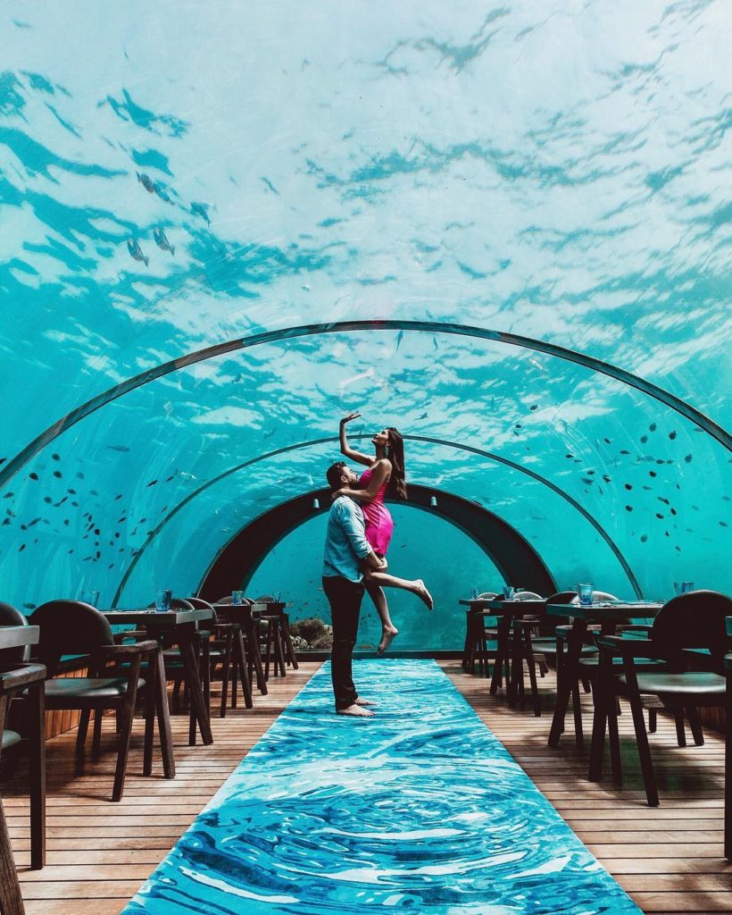 Taken in 5.8 Undersea, the deepest undersea restaurant while vacationing in sunny Maldives. Alice and Ali hit paradise recently, and we’re all jealous! Visit the couple’s heavenly honeymoon Vlog here.