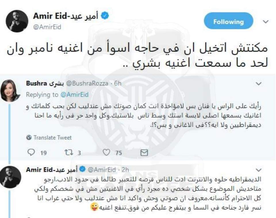Eid tweeted, “I thought there is nothing worse than Mohamed Ramadan’s Number One’s music video until I heard Bushra’s song”. Brutal honesty much? What’s even more entertaining is Bushra’s reply, “Your opinion is much respected, however, you don’t sound like the ‘Andaleeb’, yet I love your lyrics and songs and I listen to them. I am wearing an elastic band amidst plastic people. Everyone is free to do what he wants as we’re a democracy, or is that not the case when it comes to music?”.