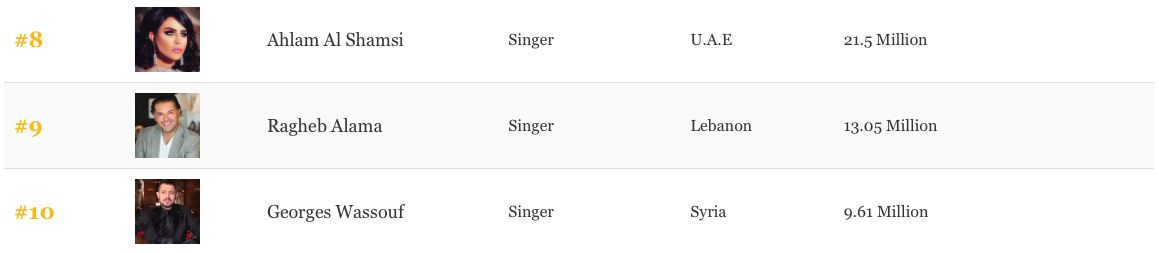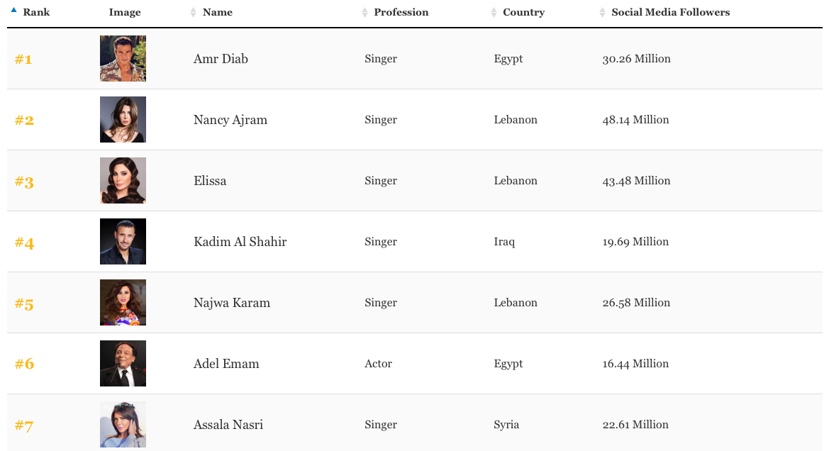 Forbes team looked over 500 celebrities with over three million followers on social media and calculated the length of the celebrity’s showbiz career, as well as activities outside their dominant field. It is no surprise that El Hadaba, Amr Diab, was named the most influential celebrity in 2017. Nancy Ajram, Elissa, Kazem El Saher and Najwa Karam were among the top five influential celebrities.