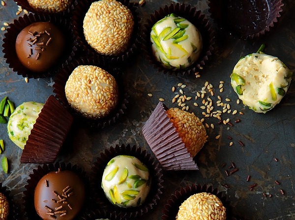 Tahini is widely adored as the ultimate condiment to most Arab dishes but what’s also great about it is that it can be made sweet with the addition of powdered milk and sugar, creating the much loved dessert known as halawa. To up the ante even higher, you can revamp the sugary tahini-based dessert into elegant mini truffles of three different coatings: sliced pistachio, toasted sesame and chocolate.