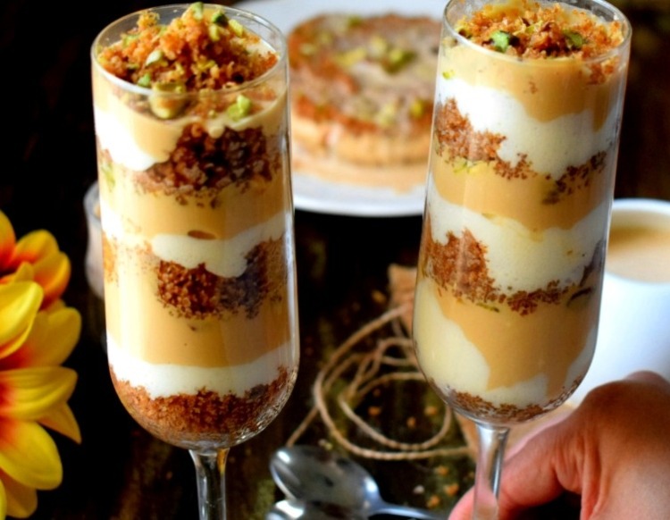 This is probably the easiest recipe on this list as all you’ll need to do is roast some konafa hairs with butter in a pan, set that aside then for the toffee sauce, mix together fresh cream, dulce de leche and coconut milk and finally, make the whipped cream by mixing it with cream cheese so it can have a firm and sticky texture. Then comes the assembly part, you’ll take a tall glass, add in the konafa, followed by the whipped cream then the toffee sauce and repeat this step until the entire glass is filled to the brim. For the full recipe, you can head to the from my kitchen blog.