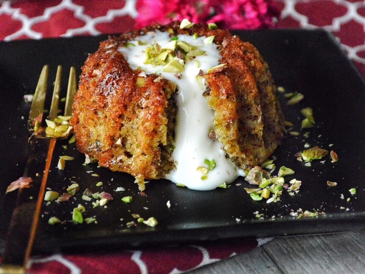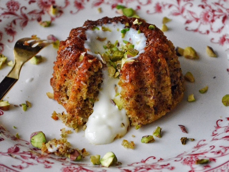 For the cake portion, you’ll grind together bread crumbs, pistachio, baking powder and cinnamon in a food processor and then follow that by mixing the nut mixture with eggs, sugar and melted butter and then baking the entire mixture in a mini bundt pan. For the mahalabia portion, just heat up milk, cream, condensed milk and corn flour in a pan until it thickens. Then whip the mixture using an electric mixer to get that satiny smooth texture for the cream. The final step is to pour in the cream onto the center of the cake and sprinkle in some pistachio for an added fun garnish. To know all the measurements needed, check out the full recipe on the sweet and savory blog.