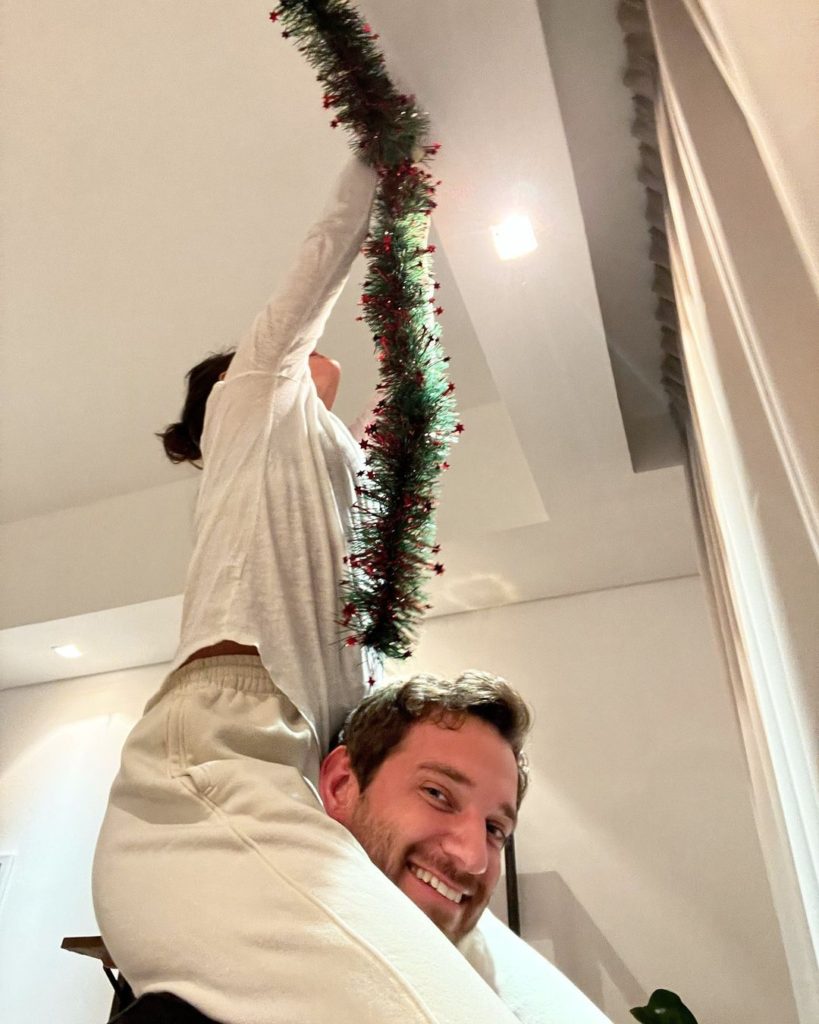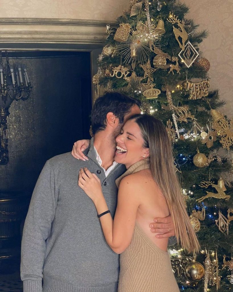 Lara and her hubby hug by their golden Christmas tree, looking cheerful as ever! Her Ig caption read: “Christmas & Cream”.