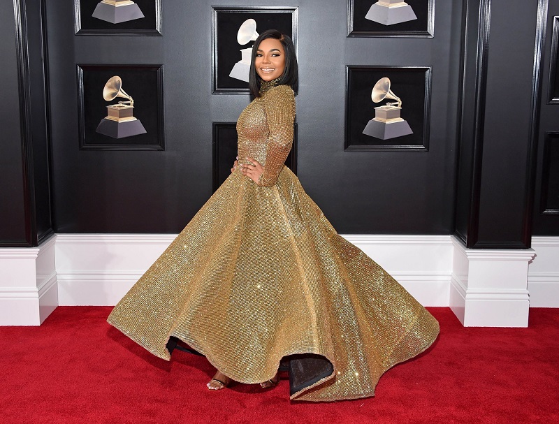 The American Singer Ashanti sparkled in a gold, long-sleeved Yas Couture dress by the Lebanese Elie Madi.