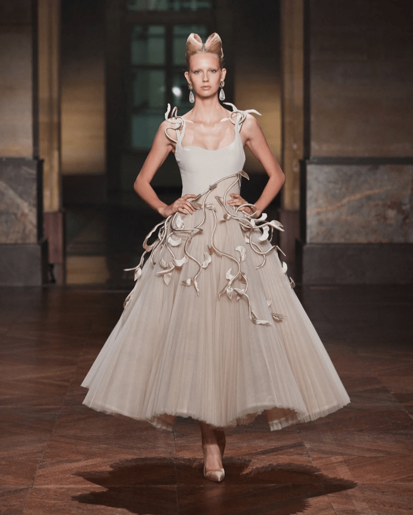 Elie Saab, never one to miss a moment, delivered his royal fantasy on Day 3 with La Nouvelle Cour. The collection felt like a modern fairytale—think opulent bows, pearl embroidery, regal silhouettes, and sugar-pastel hues clashing with bold blacks and golds.