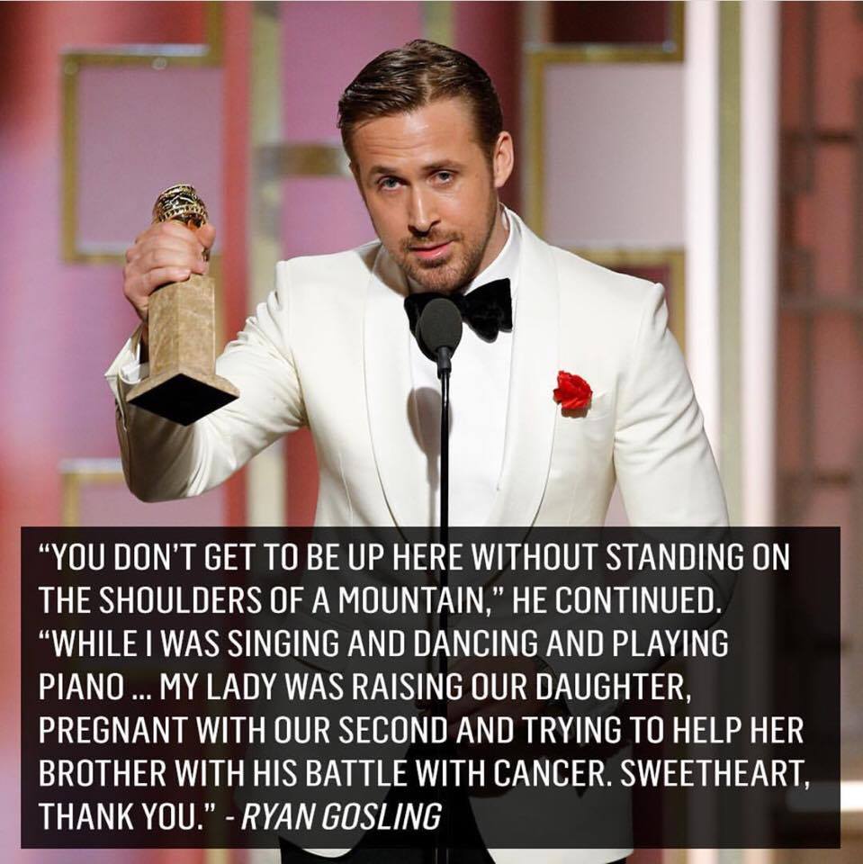 As you probably already know, Ryan Gosling just snatched the Best Actor in a Comedy Award at the 2017 Golden Globes. While this came as no surprise to anyone, because, hello have you watched La La Land. What was surprising though, and more importantly very touching was his speech.