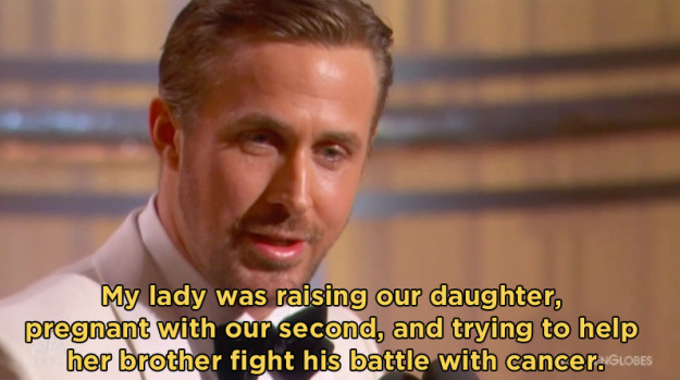 The impressive thing here (and the whole point of this rant) is the understanding that Gosling has towards the importance of his wife’s role in his life. He knows and fully acknowledges that without her taking care of their daughter, he wouldn’t have had the time to do what he loves best, and win a Golden Globe for it. He doesn’t think it’s the wife’s job to raise the kid anyway, he doesn’t believe that it’s not his responsibility, because he fully understands that it’s a shared responsibility between the two of them.