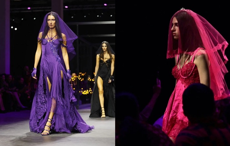 The night continued with its biggest highlight: the star studded Arab models who rocked its runway. The infamous Hadid sisters, both of Palestinian-Dutch descent showcased Versace’s dark theme through two unique outfits. Gigi went for a full-black goth look as she rocked a mysterious dark hoodie dress while Bella went for a more colorful number as she donned a flowing dark purple laced dress and a veil.