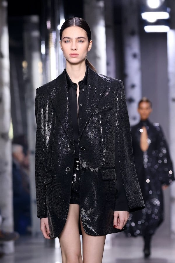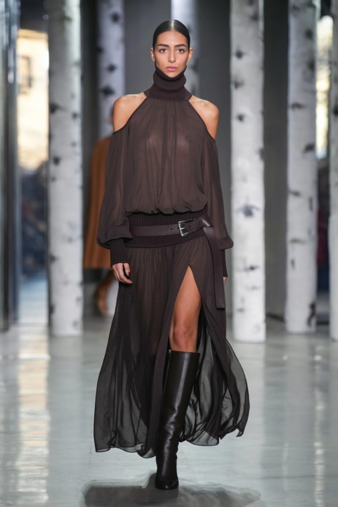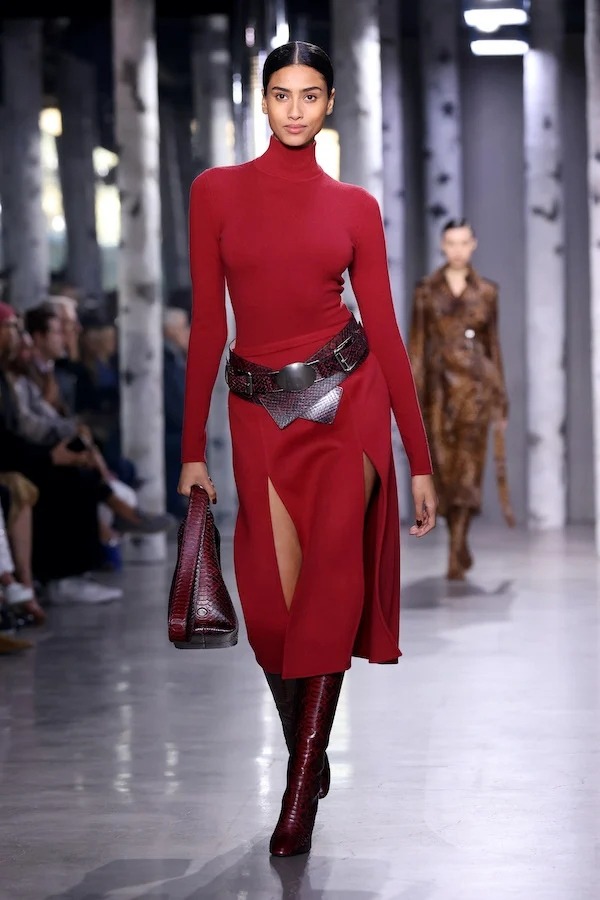 This year, Kors placed a focus on dominant and empowering looks including power suits, sweeping coats as well as flared pants. Bold and daring, some of the designs had a unique twist including evening gowns slashed with cut-outs. When it came to the models, Dutch-Moroccan-Egyptian Hammam wore a fiery red turtleneck dress with thigh high slits paired with a hip-slung bulky brown belt centered with an organic agate stone.