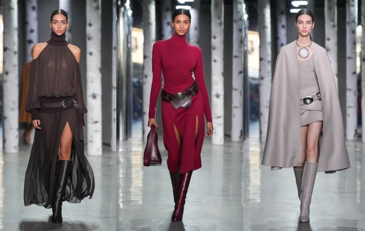 This year, Kors placed a focus on dominant and empowering looks including power suits, sweeping coats as well as flared pants. Bold and daring, some of the designs had a unique twist including evening gowns slashed with cut-outs. When it came to the models, Dutch-Moroccan-Egyptian Hammam wore a fiery red turtleneck dress with thigh high slits paired with a hip-slung bulky brown belt centered with an organic agate stone.