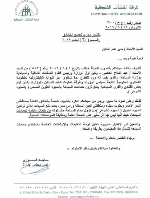 El Assy further explained that guests can only be banned from swimming if they are wearing normal clothes as blouses and pants due to the possibility of harbouring harmful bacteria and affecting the general image in front of tourists.